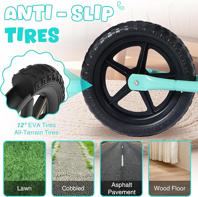 - Multi-Terrain Use Tires: Equipped with durable 12 inch EVA tires, this balance bike can easily navigate various surfaces, such as asphalt pavement, lawn, cobbled, and wood floor, making it perfect for adventures.