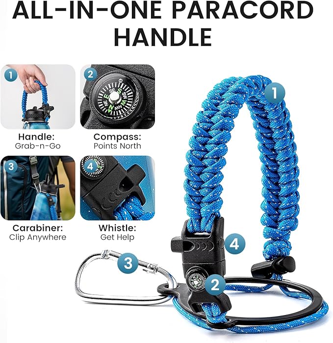 - Adventure Ready Paracord Handle: RAYMYLO 1/4 gallon water jug features a stylish color-coordinated paracord handle with a built-in compass and carabiner clip. This reusable water bottle's paracord handle is lightweight, durable, and perfect for hands-free carrying during hikes, cycling, or camping. Grab & go for spontaneous adventures under the stars!