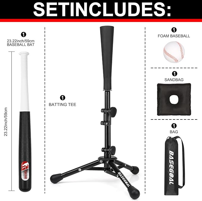 • 4.【ALL INCLUDED】This set comes complete with the Batting Tee, (1) 23 inch plastic bat,1 baseballs, and Sandbag (sand not included) by attaching it to base for extra stabilization if needed, providing you with everything you need to play!