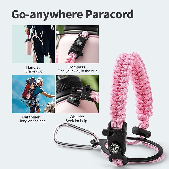 - Palm Fitting Paracord Handle: Compared to handle lids, nylon paracord on the bottle gives you more choices in terms of color coordination and coziness on your hands. Match the handle with your bottle to make a complete outdoorsy look. Compass and carabiner can be lifesavers for hiking and other expeditions