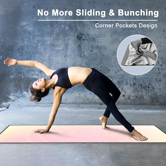 - Corner Pockets Design: Features 4 corner pockets on the backside, the non slip yoga mat towel helps secure and hold onto the mat firmly. This allows you to focus your mind, body and breath on the yoga practice, without worrying about bunching.