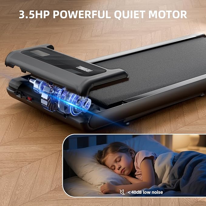 - 3.5 HP Powerful Motor: Equipped with a whisper-quiet 3.5 HP brushless motor operating under 40dB, this desk treadmill provides a powerful 120% surge horsepower while cutting energy use by 25% for efficient and tranquil workouts