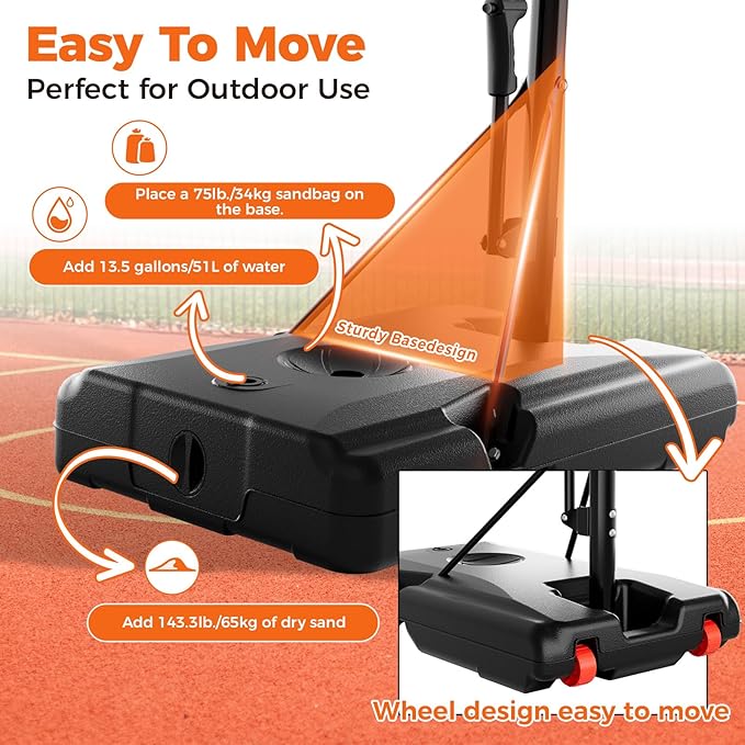 - 【STURDY BASE & PORTABLE】The portable basketball hoop is equipped with a robust and stable base triangular support structure. The high-strength PE base needs filling with water and sand to ensure stability and safety for every shot. The base is built in two wheels making it easy to move by one person. You can place it in backyards, courts, poolsides, gyms, and other indoor and outdoor places.