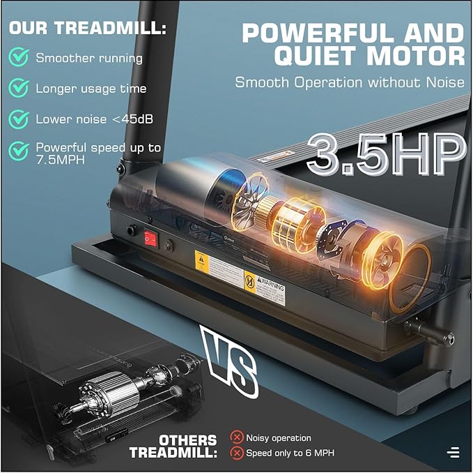 - ⚡STRONG POWER & PRECISION ➤➤3.5HP Quiet Motor: Ultra-low noise (<45dB) won’t disturb neighbors. Speed Range: From gentle rehab walks to intense runs (0.6–7.5 MPH). Real-Time Heart Rate Monitoring: Handlebar sensors keep workouts safe and effective.