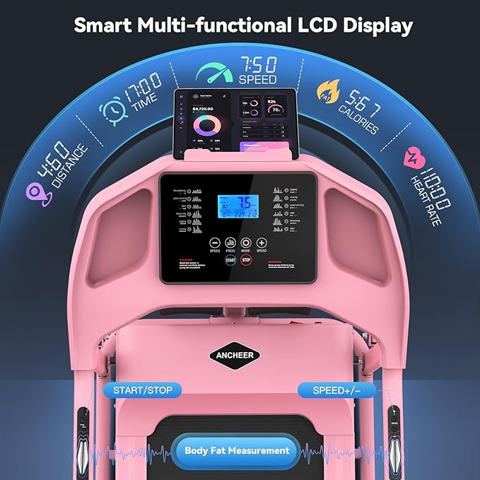 - 【Smart Fitness Tracking Treadmill】➤Dual Health Monitoring, Real-time heart rate tracking via handle sensors, Measure your body fat level easily in a few steps. Eliminates need for separate smart scales & HR monitors.With a Mult-function LCD display, you can track the real-time data on speed, incline, time, distance, calories, and heart rate.