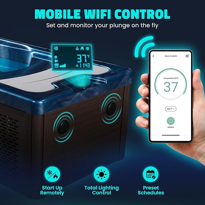 - 𝐒𝐌𝐀𝐑𝐓 𝐂𝐎𝐍𝐓𝐑𝐎𝐋 𝐒𝐘𝐒𝐓𝐄𝐌: Take full control of your cold plunge experience with just a fingertip. The WiFi App control system lets you adjust water temperature, lights, and jets right from your mobile or the built-in touchscreen. Customize every session for your perfect plunge