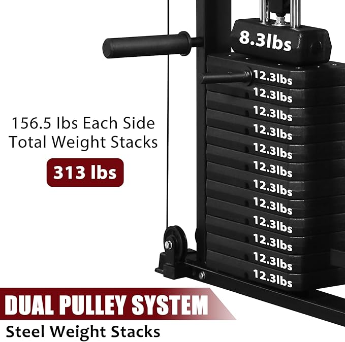 - Weight Stack System: MUSEPT Smith Machine includes dual integrated weight stacks (313lbs total, 156.5lbs each side), providing quick and smooth resistance adjustment without the need for weight plates. The cable system features a 2:1 pulley ratio, ideal for controlled strength training and rehabilitation movements.
