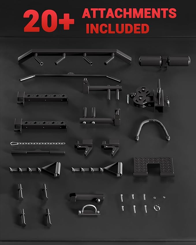 - 【Cable Machine】 The home gym machine is equipped with PU cables, PU pulley, solid steel rails, and liner bearing to ensure quiet operation. With 15 adjustable height positions, it can meet various training needs such as fly, lat pull down, lifting, curls, rows, and more.