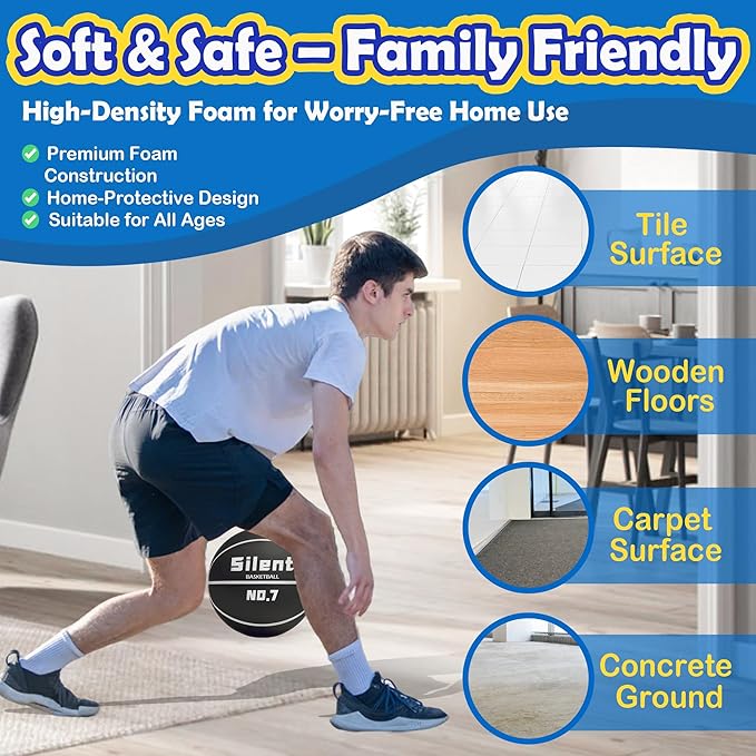 - 6. Multi-Surface Mastery & Floor Protection Dribble worry-free on any surface! The ultra-soft foam core absorbs impact, protecting hardwood floors, laminate, or delicate decor. Use it in living rooms, basements, or dorm halls—zero scratches, 100% fun. A must-have for noise-sensitive communities or fitness buffs craving indoor workouts