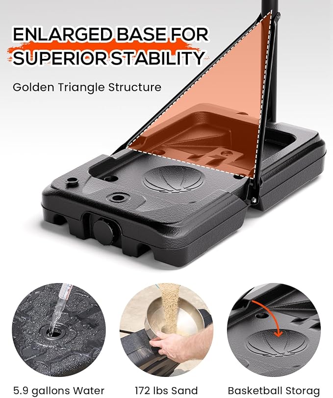 - Heavy-Duty Stability: Achieve professional-grade stability by filling the base with 172 lbs (78 kg) of dry sand, then adding 5.9 gallons of water for maximum weight and balance. For extra security during aggressive play, place two 75 lb sandbags on the base (as shown). This system ensures zero wobble during dunks and intense games, keeping the basketball goal & hoop rock-solid on any surface